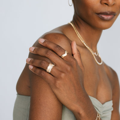 This bold architectural ring features a striking design made up of vertical gold bars that resemble a corrugated or ridged texture. The top edges of these vertical bars are set with a scattered array of small, sparkling diamonds, giving it a look that’s both modern and organic — like a golden skyline dusted with diamonds.