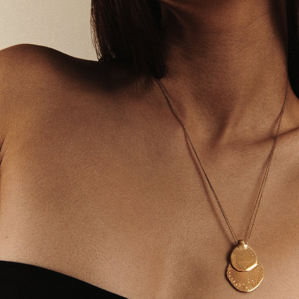 Characterized by irregular edges, diamonds engulfed in gold, and hand stamping details. This organic pendant has a hint of sparkle, engraved with tiny star diamonds, and hangs from a 9k gold chain.