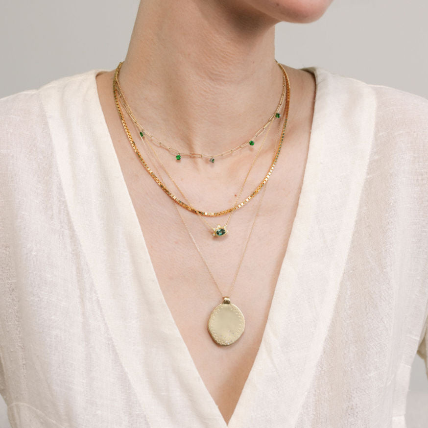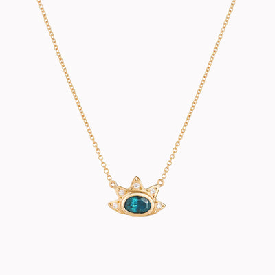 18k gold georgian bezel toumaline sun beam necklace radiates sparkle with diamond accents.