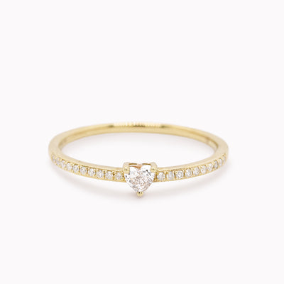 A delicate 14k yellow gold band encompassed with pavé diamonds and a diamond heart center.