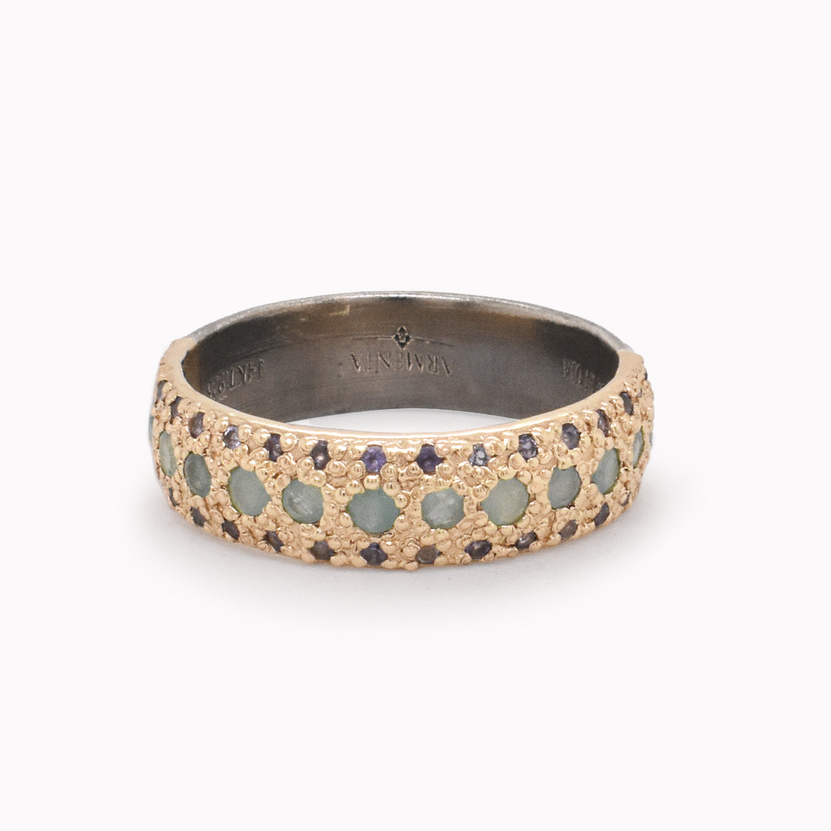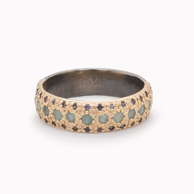 Wide rose gold band featuring rows of petite purple iolite and grandidierite gemstones.