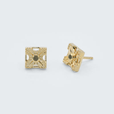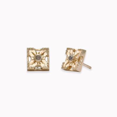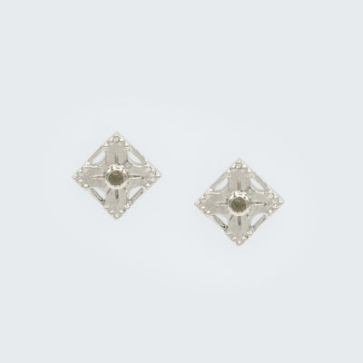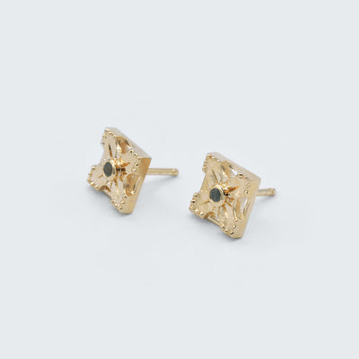 Elegant diamond-shaped earrings with intricate engravings, featuring a vibrant gemstone. The Labradorite shown symbolizes "L" for the word "Love" and the stone symbolizes tranquility.