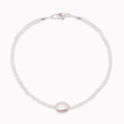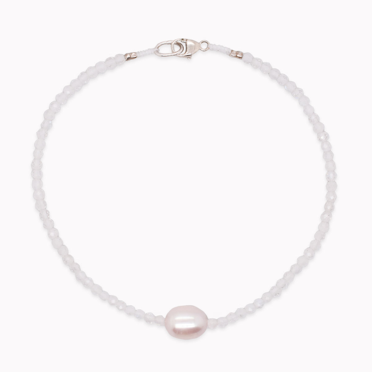 Petite rainbow moonstone beads are strung together on this bracelet with a keishi pearl center bead accent with a sterling silver clasp.