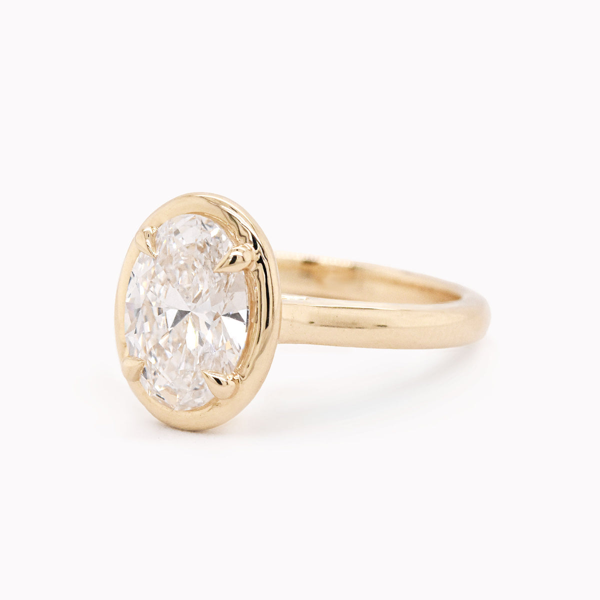 The Ashton engagement ring combines striking design elements with refined craftsmanship. Designed for someone with confident personal style, this ring makes a statement while maintaining sophisticated appeal. The design reflects modern sensibilities and suits someone who values both quality and distinctive aesthetics, with a 2.07 carat bezel set lab grown oval diamond in a petite tab claw prong setting.