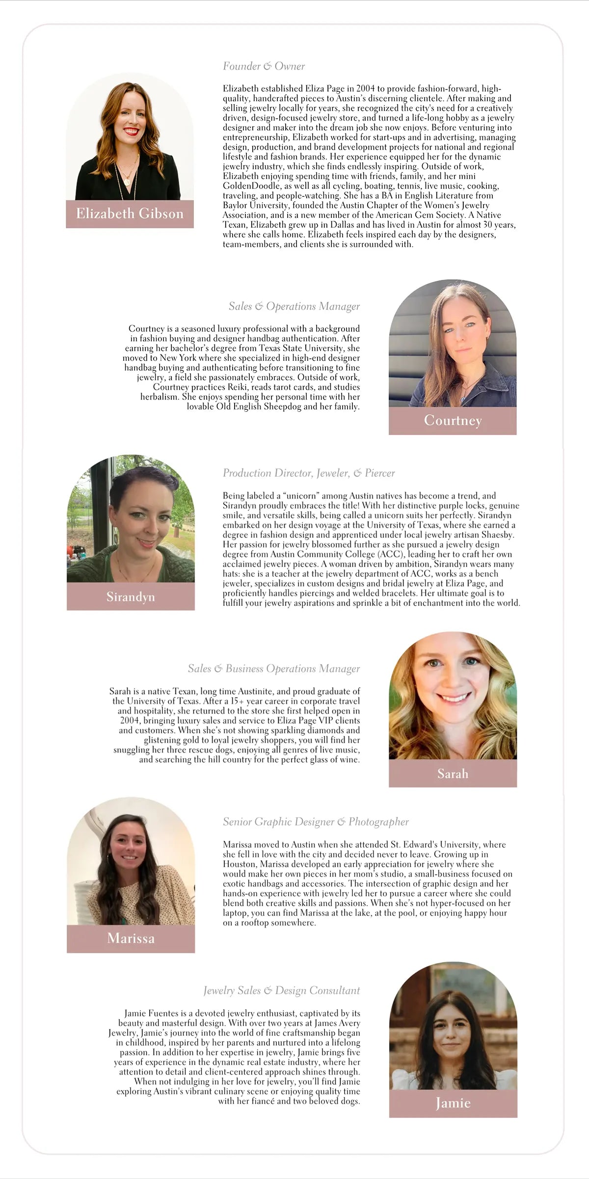 At Eliza Page, we’ve been showcasing curated, designer jewelry from select artists since 2004. Our luxury jewelry collections emphasize quality, sustainability, and craftsmanship, and include custom pieces designed & finished by artisans from Austin, Texas and around the world.