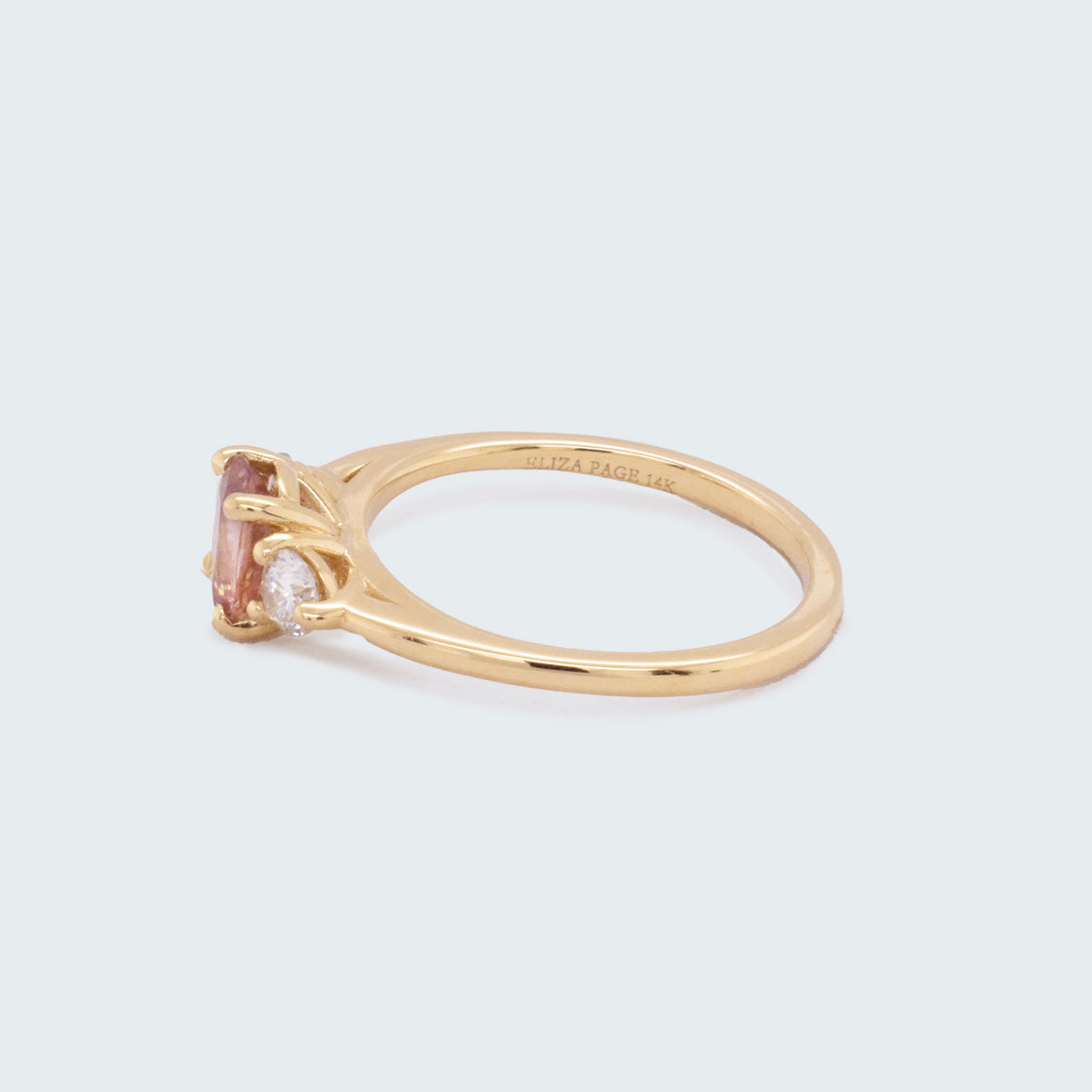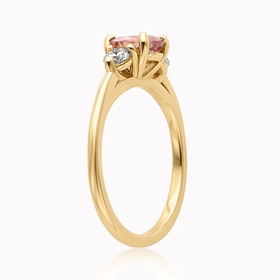 Our Cecile engagement ring setting shown with a vibrant 0.88ct oval pink sapphire center stone and sparkling white diamonds on each side. Part of our exclusive Eliza Page Collection