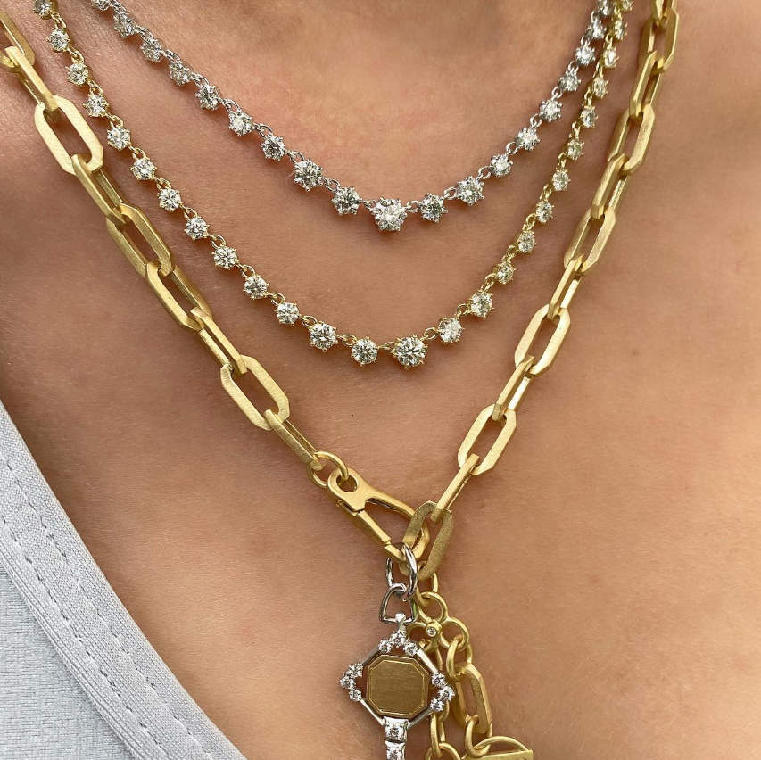 The Large Penelope Diamond Necklace is handcrafted in 18-karat gold and features 2.26 carats of round brilliant-cut diamonds. Easy to wear and goes with everything, the Large Penelope Diamond Necklace moves with you and drapes delicately around your neck.