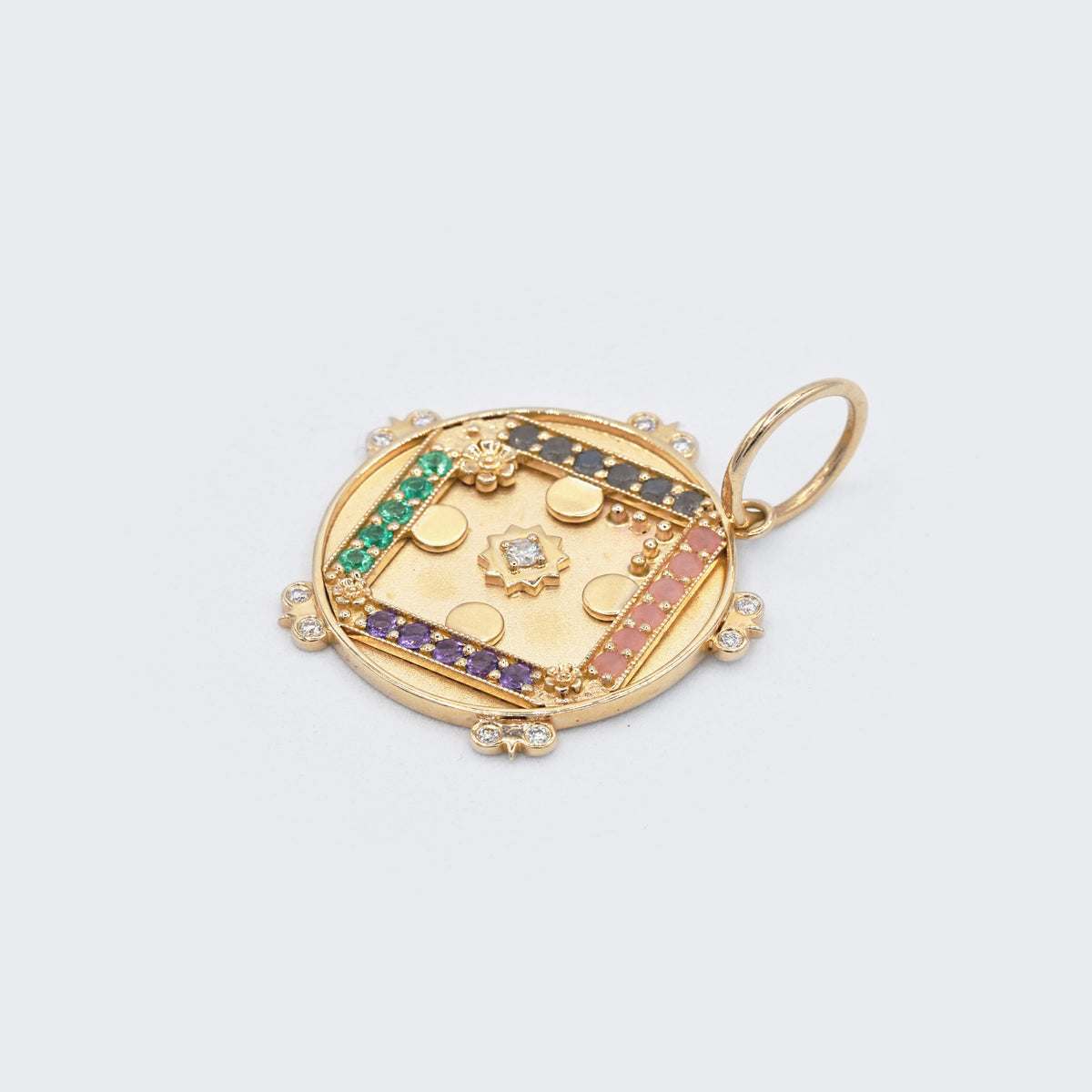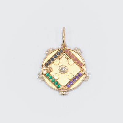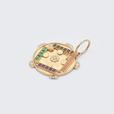 Sun Medallion featuring 4 rows of gemstones (23) with diamond accents spelling “Love” symbolizing commitment, care and devotion.