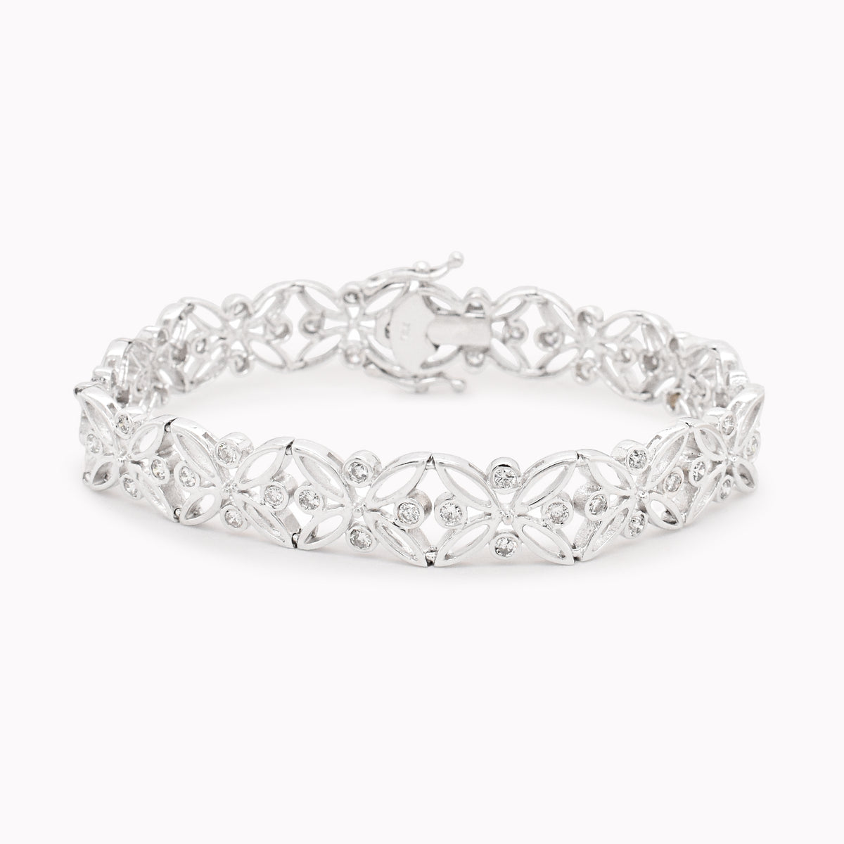 Timeless and intricate, this ornate diamond bracelet in white gold captures the romance of vintage design. Its openwork pattern features elegant marquise and round motifs adorned with sparkling diamonds, creating a lace-like texture that shimmers with every movement. Sophisticated yet statement-making, this bracelet evokes the beauty of heirloom jewelry—perfect for special occasions or adding a touch of old-world glamour to the everyday.