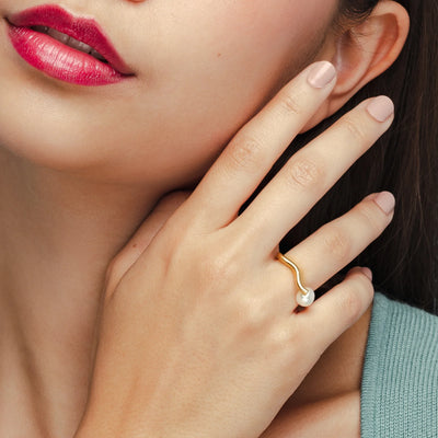The subtlety and uniqueness of this ring take a moment to register, making it all the more special for those who are curious and perceptive. The soft wave of the 14k gold-fill band runs across the top of your finger dropping down to the pearl, nestled just on the side. Some variations in size will occur with the differences in the natural pearls, which are typically 1/4" in diameter. This actually makes this ring particularly good for those who have larger knuckles, as a simple twist allows the ring to be slipped on at the perfect angle comfortably over your joint.