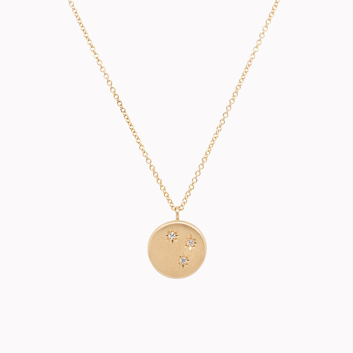Three white diamonds dance around this celestial necklace. Beautiful hand engraving adds rich detail around each sparkling diamond like stars.
