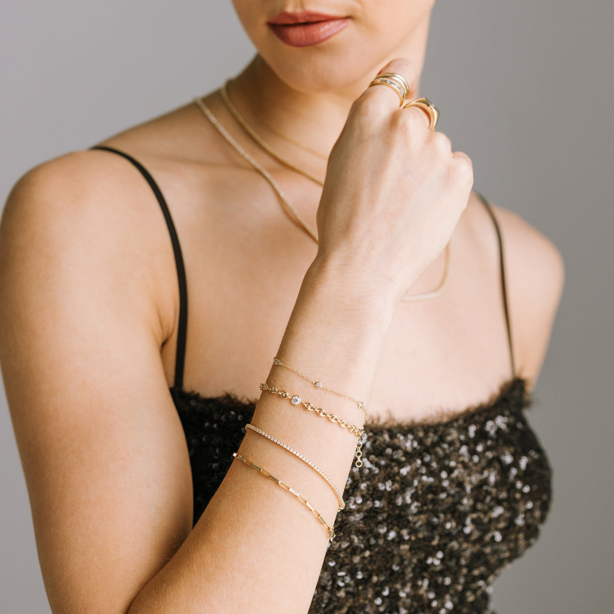Petite one carat diamond stacking tennis bracelet set in four prongs in yellow gold. Perfect for pairing with other bracelets or wearing alone.